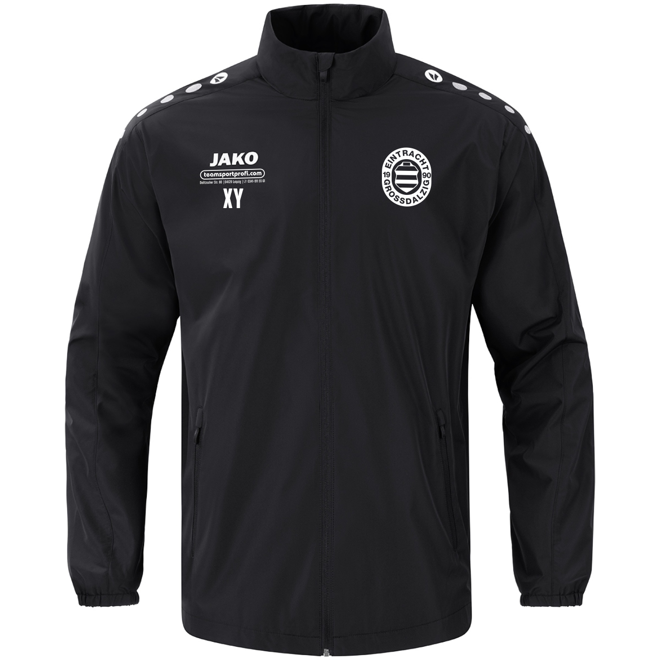 Die JAKO Allwetterjacke Team 2.0 besteht aus 100 % Polyester. Ein hochfunktionelles, wasserabweisendes Obermaterial mit PU-Beschichtung hält dich bei jedem Wetter trocken. Die Kapuze, der verlängerte Rücken und die elastische Binding schützen dich vor Wind und Regen. In den integrierten Seitentaschen mit Reißverschluss kannst Du deine Wertsachen verstauen.